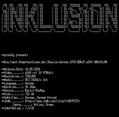 | FiLENAME: | Die.fuenf.Kampfmaschinen.der.Shaolin.German.1979.BDRiP.x264-iNKLUSiON.mkv |