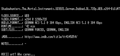 | FiLENAME: | Shadowhunters.The.Mortal.Instruments.S03E01.German.Dubbed.DL.720p.WEB.x264-BiGiNT.mkv |