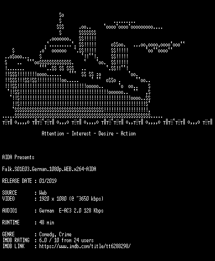 | FiLENAME: | Falk.S01E03.German.1080p.WEB.x264-AIDA.mkv |