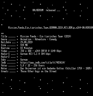 | FiLENAME: | Mission.Panda.Ein.tierisches.Team.GERMAN.2019.AC3.BDRip.x264-UNiVERSUM.mkv |