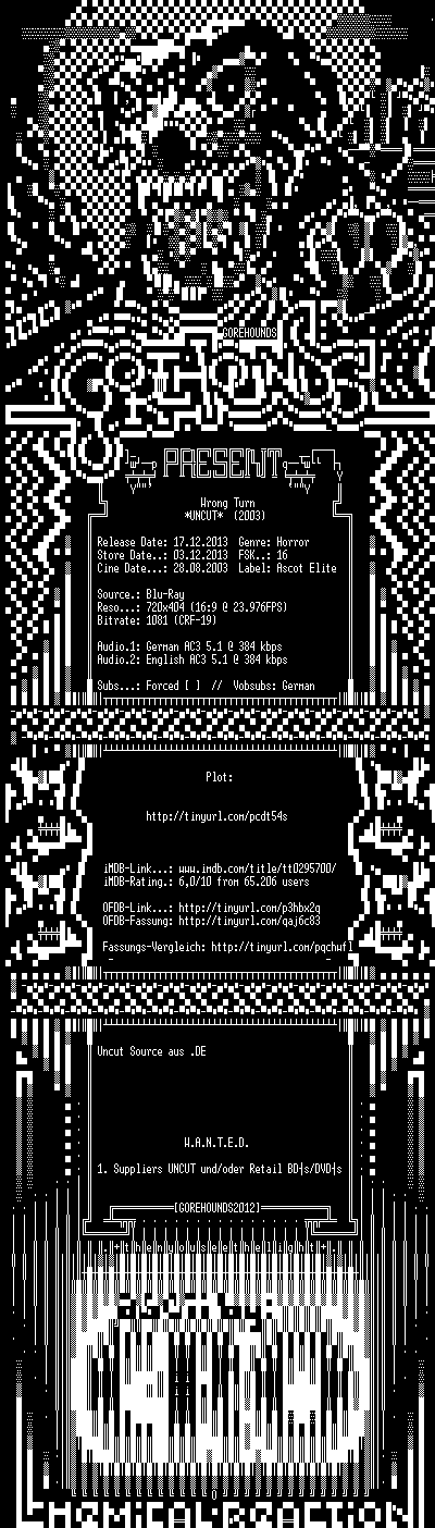 | FiLENAME: | Wrong.Turn.REMASTERED.GERMAN.2003.DL.BDRiP.x264-GOREHOUNDS.mkv |