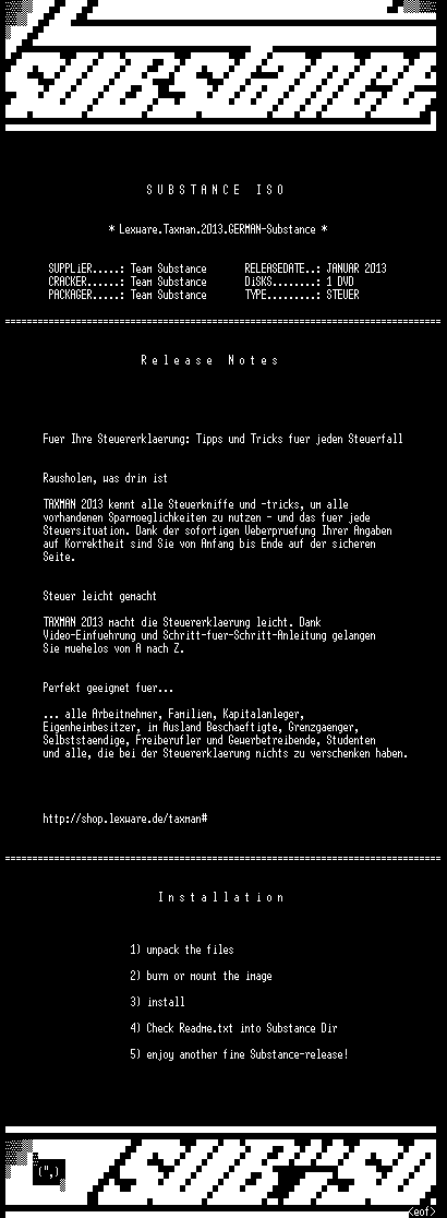 | FiLENAME: | Lexware.Taxman.2013.GERMAN-Substance.iso |
