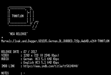 | FiLENAME: | Marvels.Cloak.and.Dagger.S01E05.German.DL.DUBBED.720p.WebHD.x264-TVNATiON.mkv |