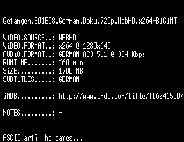 | FiLENAME: | Gefangen.S01E08.German.Doku.720p.WebHD.x264-BiGiNT.mkv |