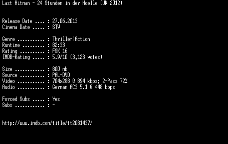 | FiLENAME: | Last.Hitman.24.Stunden.in.der.Hoelle.German.2012.AC3.DVDRiP.XViD-EXQUiSiTE.avi |