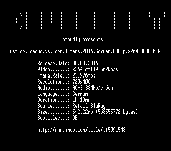 | FiLENAME: | Justice.League.vs.Teen.Titans.2016.German.BDRip.x264-DOUCEMENT.mkv |