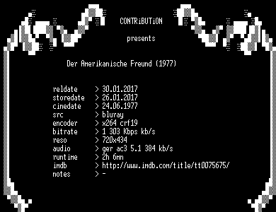 | FiLENAME: | Der.Amerikanische.Freund.1977.Remastered.German.BDRip.x264-CONTRiBUTiON.mkv |