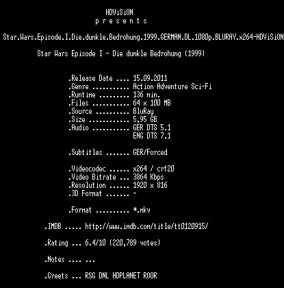 | FiLENAME: | Star.Wars.Episode.I.Die.dunkle.Bedrohung.1999.GERMAN.DL.1080p.BLURAY.x264-HDViSiON.mkv |