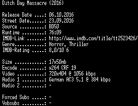 | FiLENAME: | Ditch.Day.Massacre.German.2016.AC3.BDRip.x264-SPiCY.mkv |