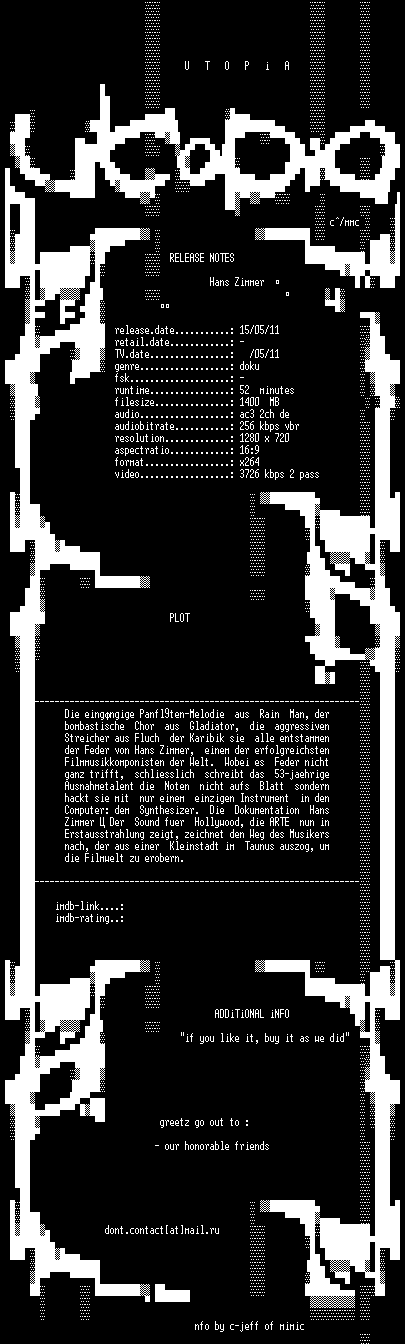 | FiLENAME: | Hans.Zimmer.Der.Sound.fuer.Hollywood.German.DOKU.720p.HDTV.x264-UTOPiA.mkv |