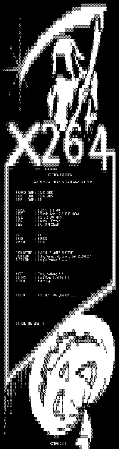 | FiLENAME: | Red.Machine.Hunt.or.Be.Hunted.German.2014.AC3.BDRiP.x264-XF.mkv |