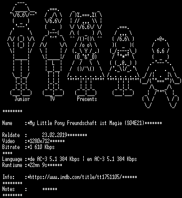 | FiLENAME: | My.Little.Pony.Freundschaft.ist.Magie.S04E21.German.DL.720p.WEBHD.x264-JuniorTV.mkv |