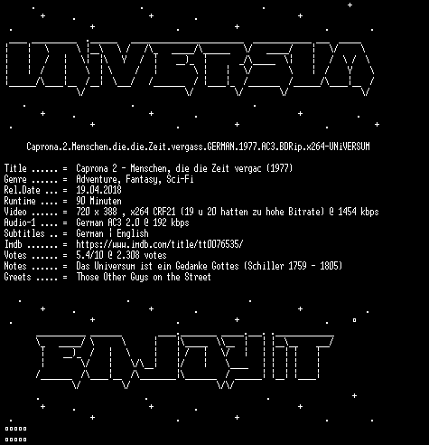 | FiLENAME: | Caprona.2.Menschen.die.die.Zeit.vergass.GERMAN.1977.REMASTERED.AC3.BDRip.x264-UNiVERSUM.mkv |