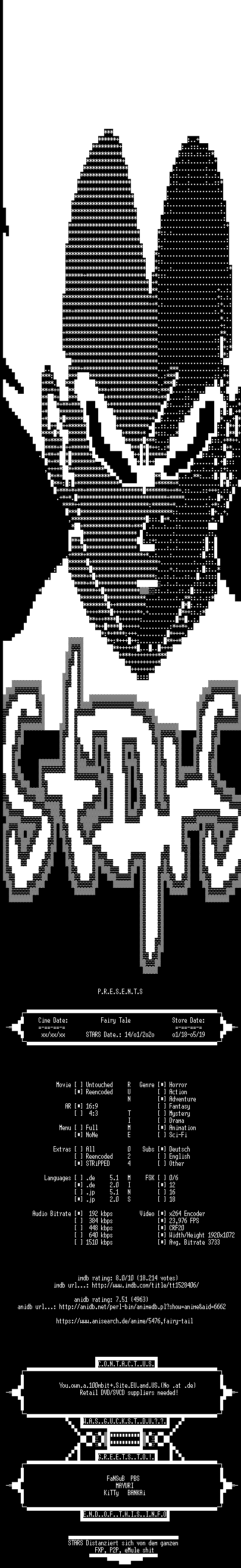 | FiLENAME: | Fairy.Tail.E102.Staehlerne.Seele.German.2009.ANiME.DL.1080p.BluRay.x264-STARS.mkv |
