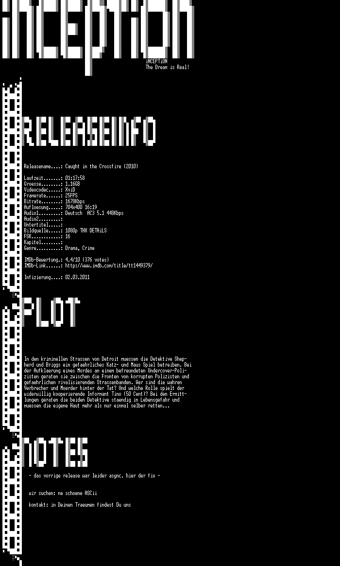 | FiLENAME: | In.the.Crossfire.2010.German.AC3.HDRip.XviD-iNCEPTiON.avi |
