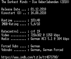 | FiLENAME: | The.Darkest.Minds.Die.Ueberlebenden.German.2018.AC3.BDRip.x264-COiNCiDENCE.mkv |