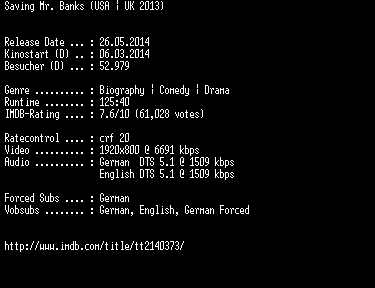 | FiLENAME: | Saving.Mr.Banks.German.DL.1080p.BluRay.x264-EXQUiSiTE.mkv |