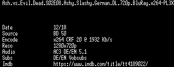 | FiLENAME: | Ash.vs.Evil.Dead.S02E08.Ashy.Slashy.German.DL.720p.BluRay.x264-PL3X.mkv |
