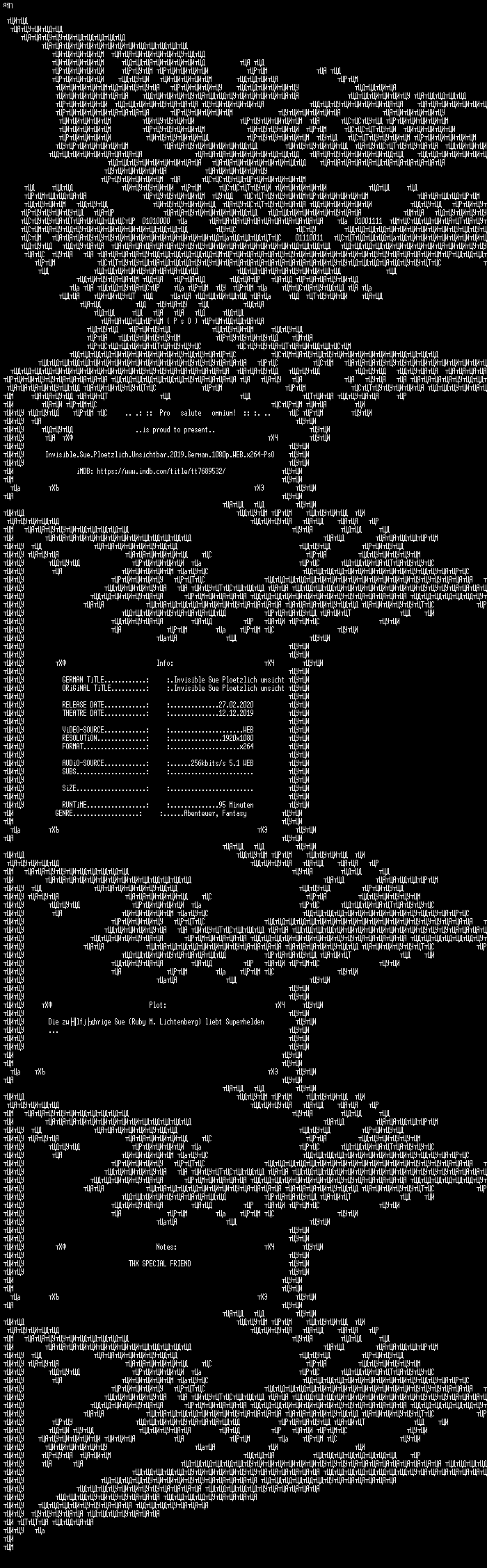 | FiLENAME: | Invisible.Sue.Ploetzlich.Unsichtbar.2019.German.1080p.WEB.x264-PsO.mkv |