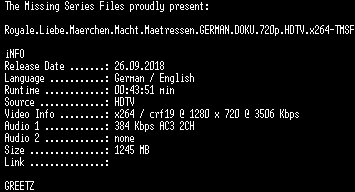 | FiLENAME: | Royale.Liebe.Maerchen.Macht.Maetressen.GERMAN.DOKU.720p.HDTV.x264-TMSF.mkv |