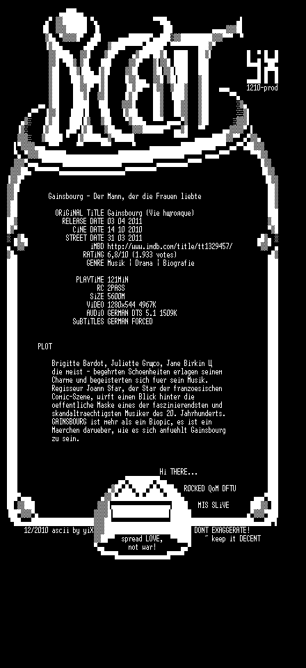 | FiLENAME: | Gainsbourg.Der.Mann.der.die.Frauen.liebte.German.720p.BluRay.x264-DECENT.mkv |