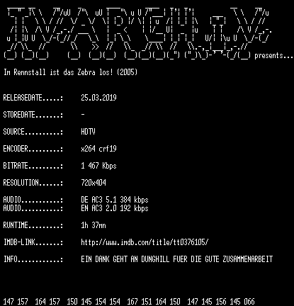 | FiLENAME: | Im.Rennstall.ist.das.Zebra.los.2005.GERMAN.DL.HDTVRip.x264.iNTERNAL-TVARCHiV.mkv |