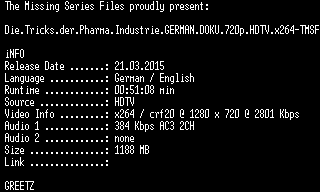 | FiLENAME: | Die.Tricks.der.Pharma.Industrie.GERMAN.DOKU.720p.HDTV.x264-TMSF.mkv |