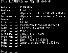 | FiLENAME: | 23.Morde.S01E05.German.720p.WEB.x264-WvF.mkv |