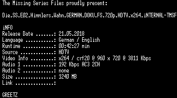 | FiLENAME: | Die.SS.E02.Himmlers.Wahn.GERMAN.DOKU.FS.720p.HDTV.x264.iNTERNAL-TMSF.mkv |