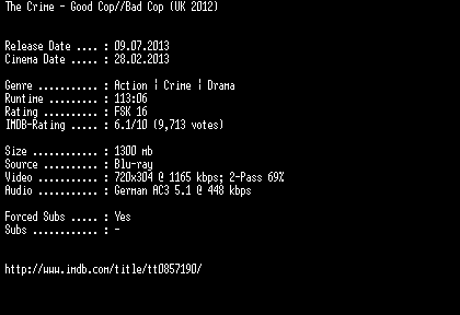 | FiLENAME: | The.Crime.Good.Cop.Bad.Cop.German.2012.AC3.BDRiP.XViD-EXQUiSiTE.avi |