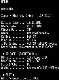| FiLENAME: | Super.Shut.up.Crime.2010.German.AC3.DVDRip.XviD-MORTAL.avi |