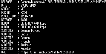 | FiLENAME: | Cannon.Busters.S01E08.GERMAN.DL.ANIME.720P.WEB.X264-WAYNE.mkv |
