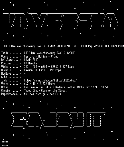 | FiLENAME: | XIII.Die.Verschwoerung.Teil.2.GERMAN.2008.REMASTERED.AC3.BDRip.x264.REPACK-UNiVERSUM.mkv |