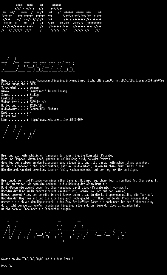 | FiLENAME: | Die Madagascar Pinguine in vorweihnachtlicher Mission (2005) [GER 720p BD].mkv |