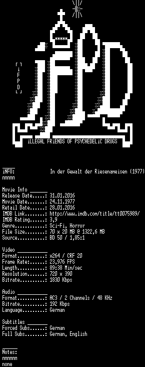 | FiLENAME: | In.der.Gewalt.der.Riesenameisen.German.1977.AC3.BDRiP.x264-iFPD.mkv |