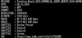 | FiLENAME: | Paradise.Beach.2019.GERMAN.DL.1080P.WEBRIP.X264-WAYNE.mkv |