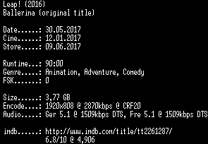 | FiLENAME: | Ballerina.-.Gib.deinen.Traum.niemals.auf.2016.German.DL.DTS.1080p.BluRay.x264-CiNEViSiON.mkv |