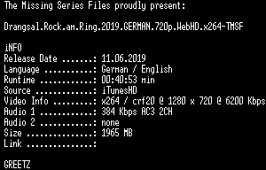 | FiLENAME: | Drangsal.Rock.am.Ring.2019.GERMAN.720p.WebHD.x264-TMSF.mkv |