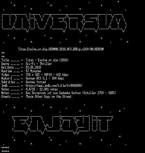 | FiLENAME: | Titan.Evolve.or.die.GERMAN.2018.AC3.BDRip.x264-UNiVERSUM.mkv |