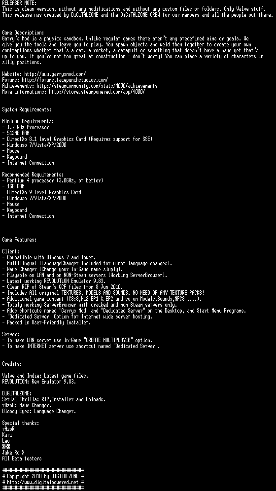 | FiLENAME: | Garrys.Mod.10.Final.2010-DiGiTALZONE.exe |