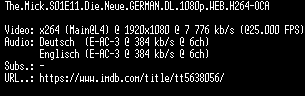 | FiLENAME: | The.Mick.S01E11.Die.Neue.GERMAN.DL.1080p.WEB.H264-OCA.mkv |