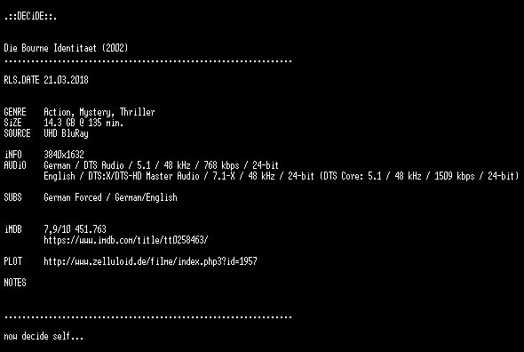 | FiLENAME: | Die.Bourne.Identitaet.2002.GERMAN.DL.2160p.UHD.BluRay.x265-DECiDE.mkv |