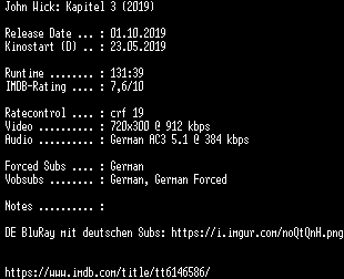 | FiLENAME: | John.Wick.Kapitel.3.German.2019.AC3.BDRip.x264.READ.NFO-COiNCiDENCE.mkv |