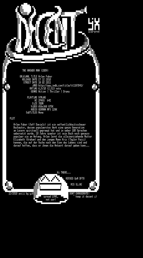 | FiLENAME: | The.Answer.Man.German.2009.BDRip.XviD-DECENT.avi |