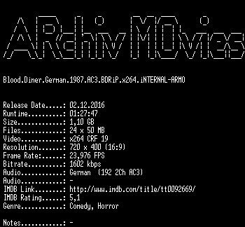 | FiLENAME: | Blood.Diner.German.1987.AC3.BDRiP.x264.iNTERNAL-ARMO.mkv |