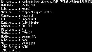 | FiLENAME: | Nachspielzeit.German.2005.DVDRiP.XViD-AMBASSADOR.avi |