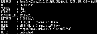 | FiLENAME: | ZeroZeroZero.2019.S01E02.GERMAN.DL.720P.WEB.H264-WAYNE.mkv |