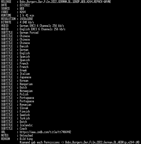 | FiLENAME: | Bobs.Burgers.Der.Film.2022.GERMAN.DL.1080P.WEB.H264.REPACK-WAYNE.mkv |