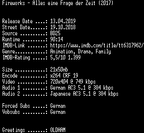 | FiLENAME: | Fireworks.Alles.eine.Frage.der.Zeit.German.2017.ANiME.DL.BDRiP.x264-SPiCY.mkv |