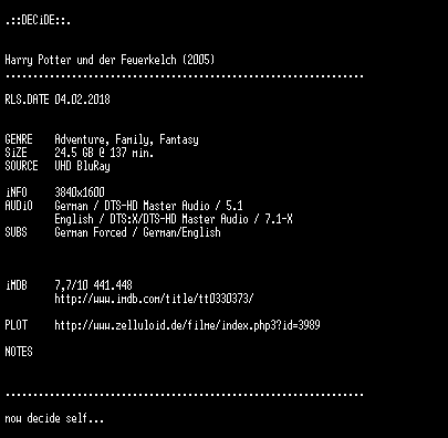 | FiLENAME: | Harry.Potter.und.der.Feuerkelch.2005.GERMAN.DL.2160p.UHD.BluRay.x265-DECiDE.mkv |